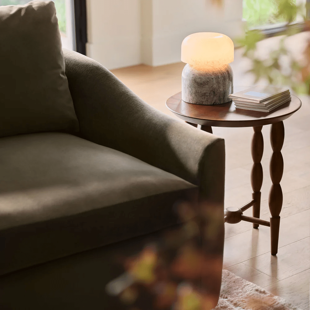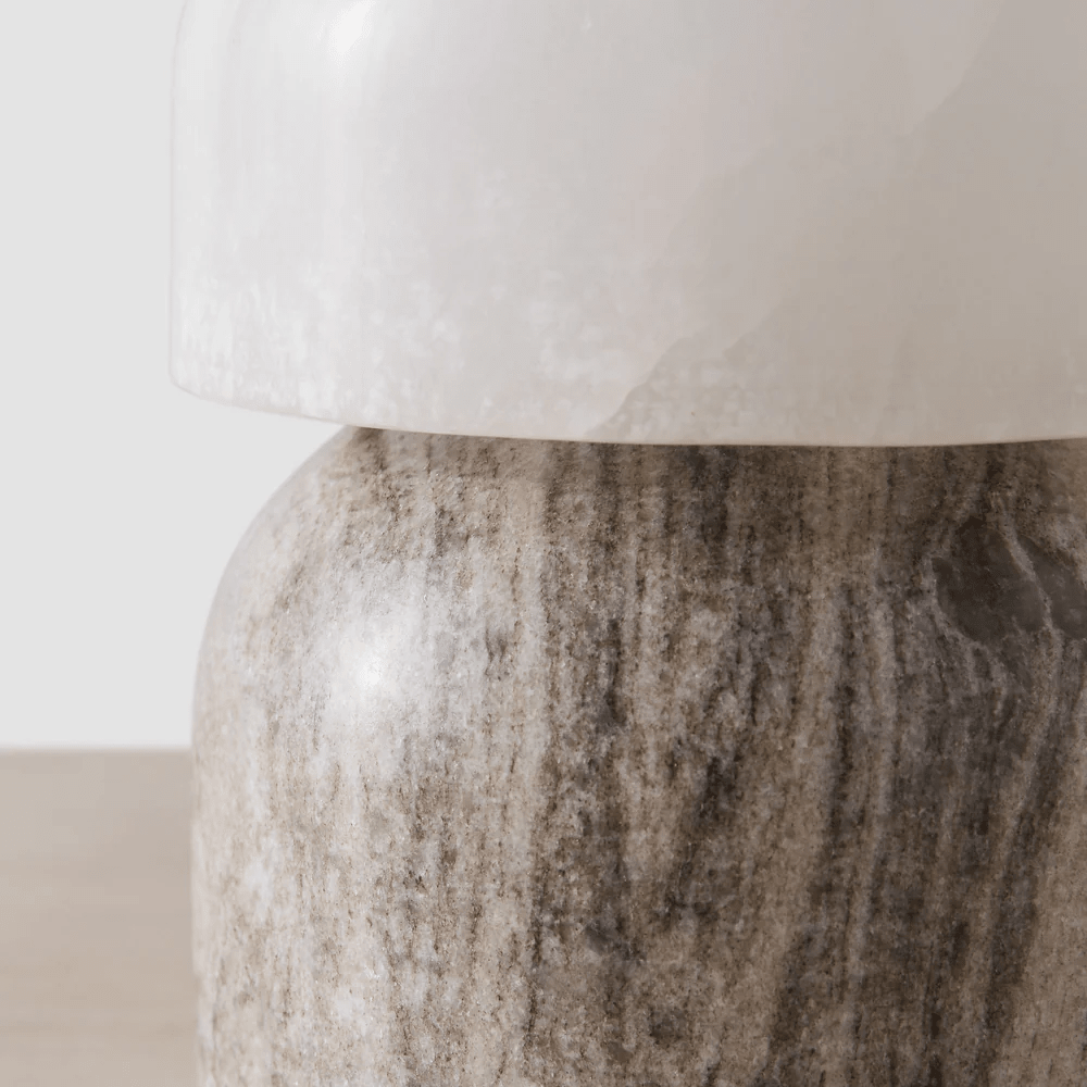 Two stones. One bright future. A glowing addition to any room of your home, this sculptural lamp mixes a richly-grained marble base with a cover carved from smooth alabaster.