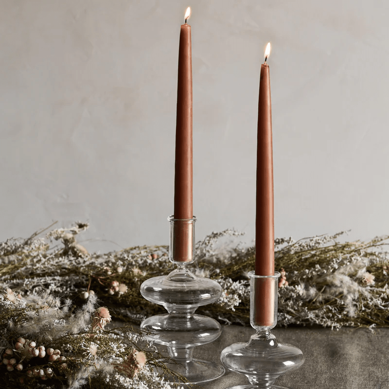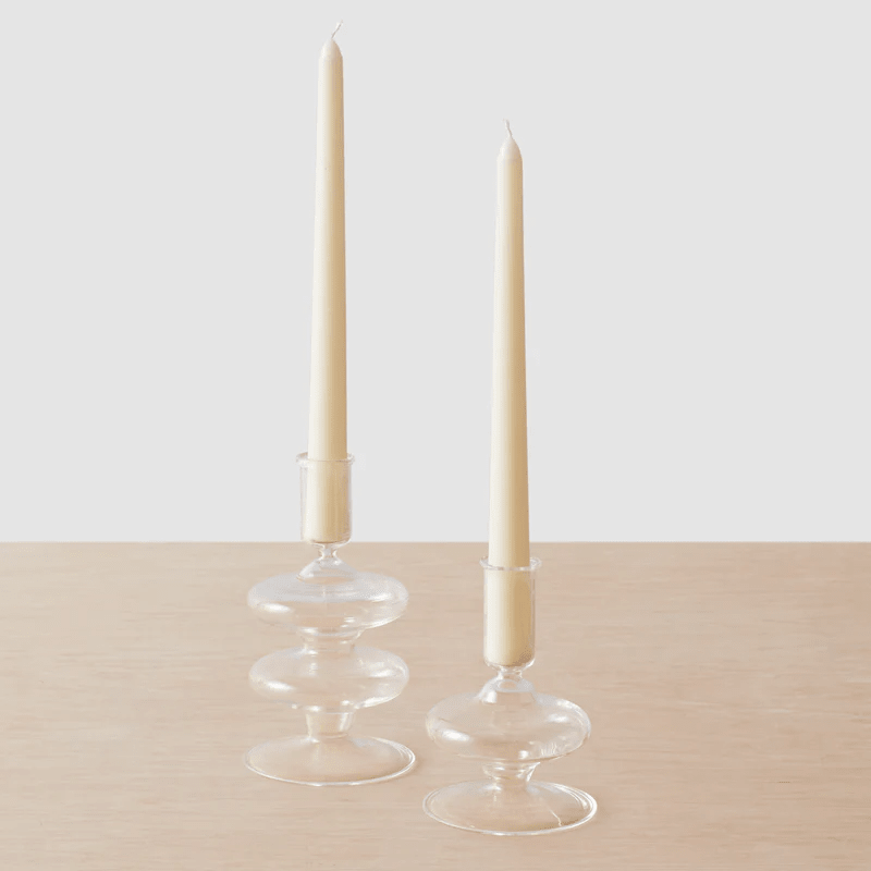 Make your space a little brighter with the warm glow of these sculptural glass candle holders.