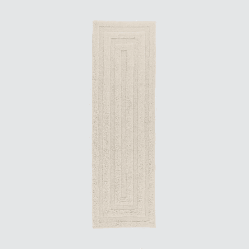 Thoughtfully scaled for smaller, high-traffic spaces, such as entryways, kitchens, and bathrooms, this rug offers a refined balance of durability and design crafted from completely washable wool. Subtle shifts in pile height lend dimension and texture while creating a contemplative, contemporary pattern of concentric rectangles.