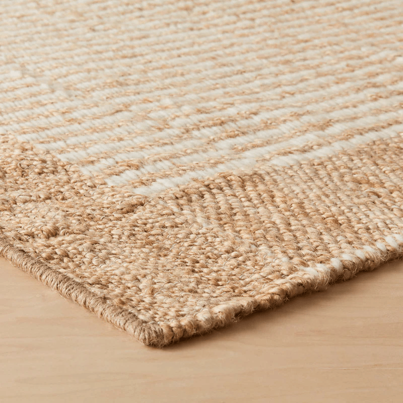 Easy to love. Easy to blend. This timeless jute accent rug plays nicely with any aesthetic, from minimal modern to eclectic boho. Mixing distinctive stripes in ecru wool with an elongated checkered pattern, each piece adds an organic warmth wherever it lands.