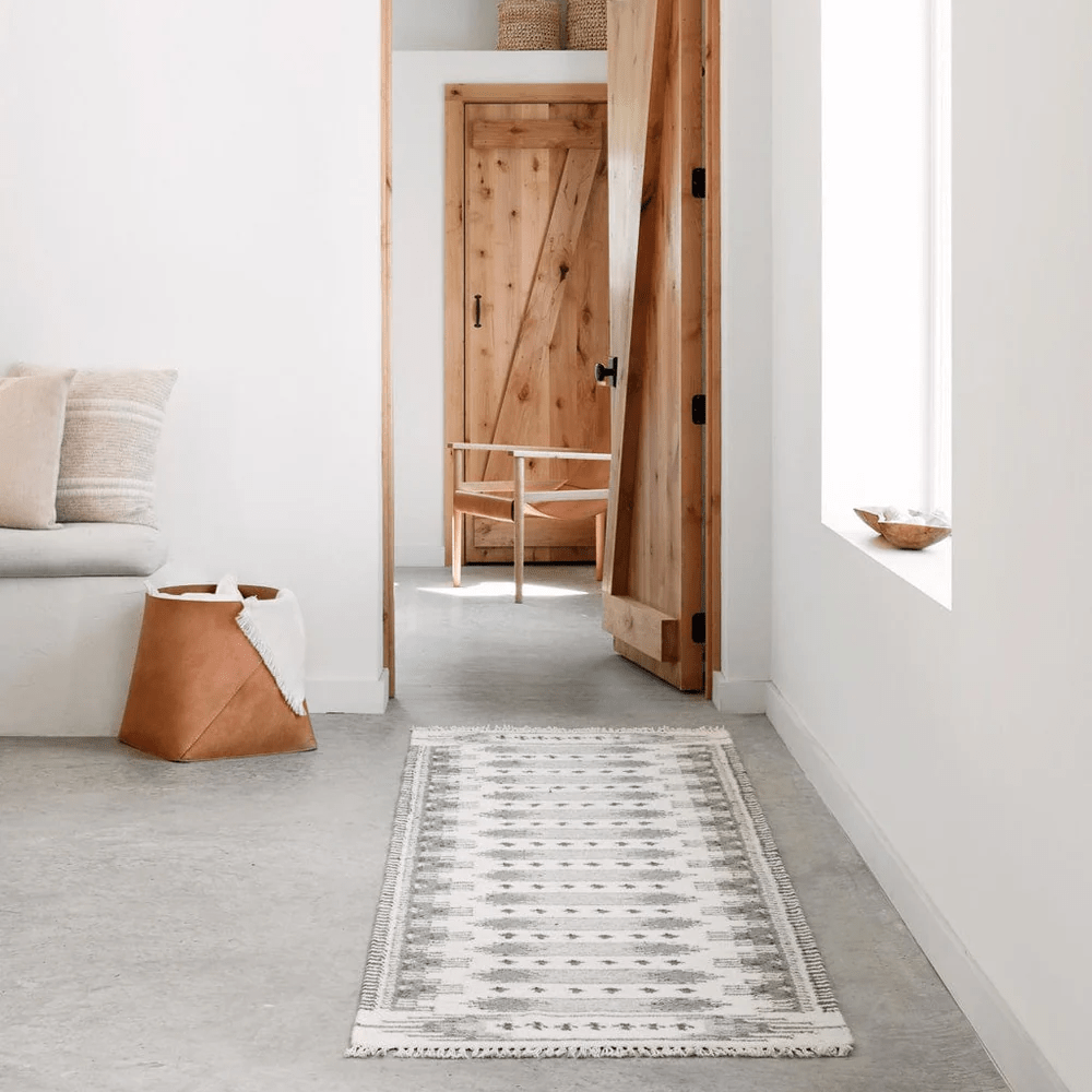 Intricate motifs and a soft grey palette make this runner an essential for any modern global space.