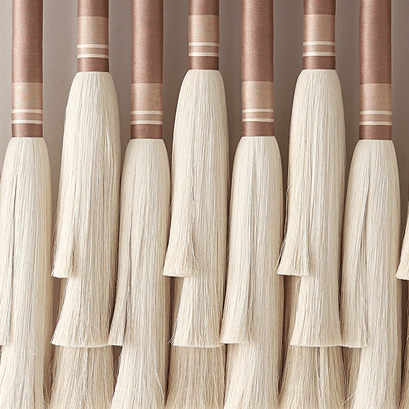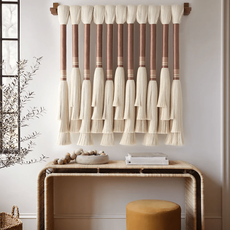 Natural raw cotton wrapped in muted clay tones, this wall hanging brings a sense of grounded beauty to any space. Each cascading layer is delicately trimmed to create sculptural depth and gentle movement. Finished with a rich Jequitiba wood rod sustainably sourced from Morocco.