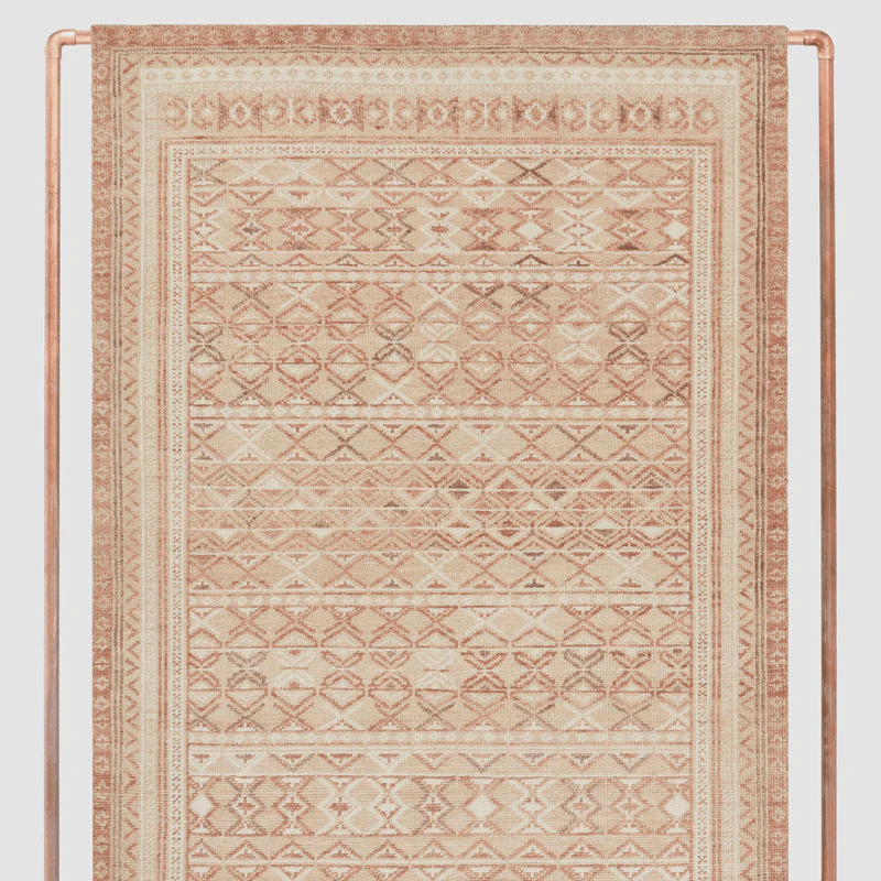 Elegance meets eccentricity. Mixing sun-bleached warm tones and irregular, repeating motifs, this hand-knotted area rug is a vintage-inspired welcome to any space. Shades of clay, sand, and rose bring out the warmth behind this global pattern, creating a warm, nurturing foundation for a living or dining room.
