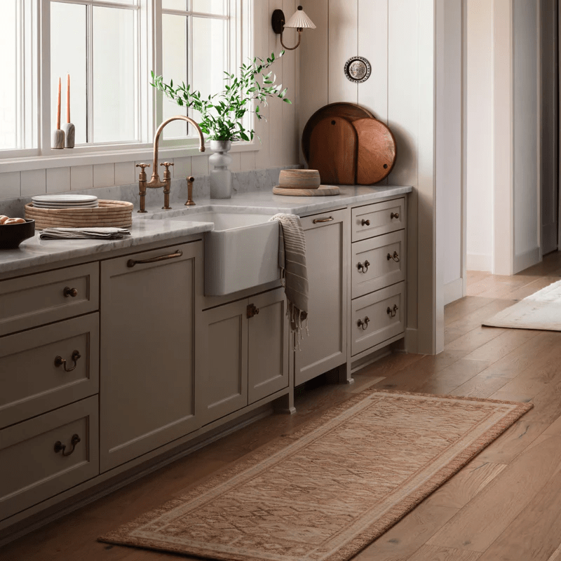 Sun-bleached and warm tones mingle with eccentric motifs in this hand-knotted, vintage-inspired accent rug.