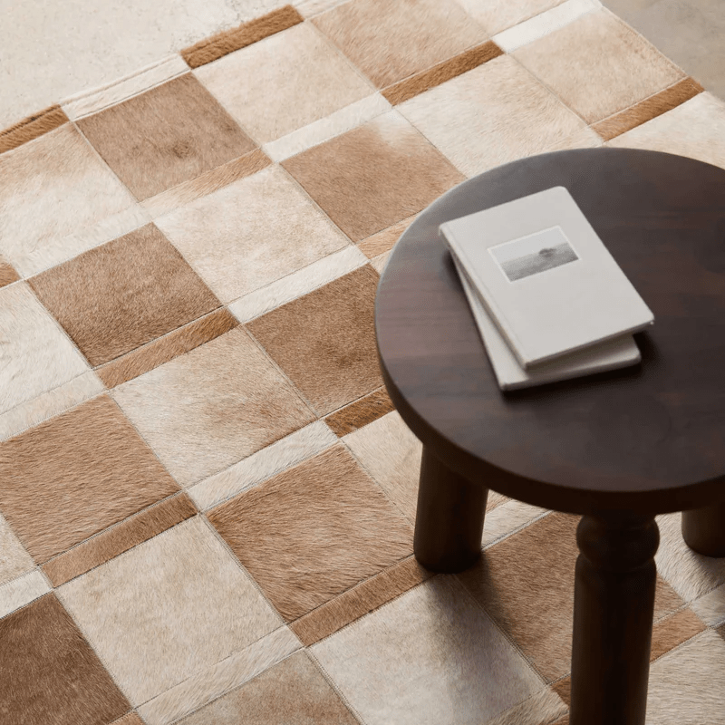 Shifting tones of sustainably-sourced cowhide come together to create an all-natural checkerboard rug.