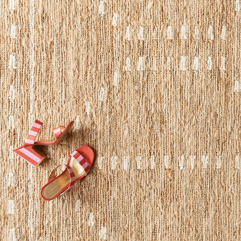 A statement in timeless simplicity, this minimal area rug adds a worldly touch wherever it goes. Weaving together natural and blonde jute, each rug is accented by dashed and solid lines, creating a geometric pattern that plays well in any space. Balanced by detailed borders on the top and bottom, this effortless rug can create a new foundation for your family room or primary bedroom.