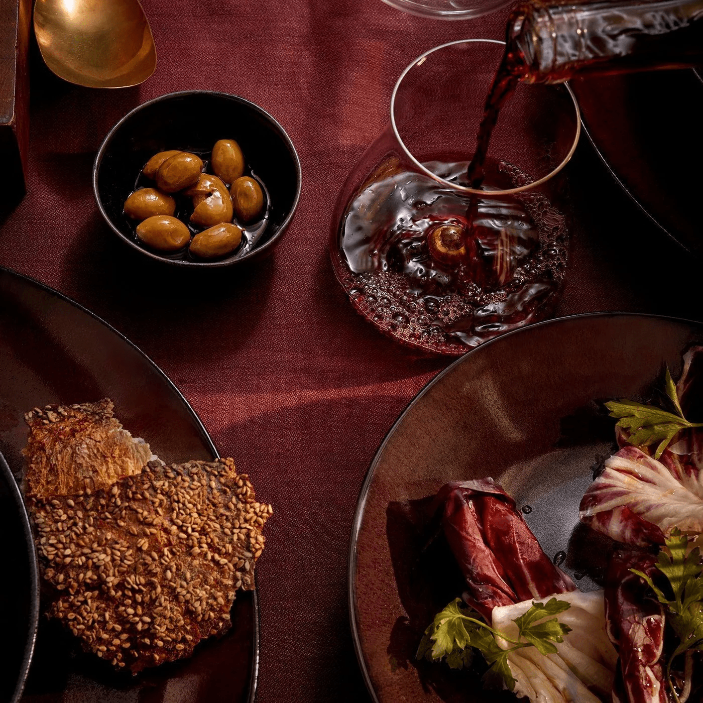 Our porcelain Terra condiment bowl is hand-crafted and glazed in our Moroccan atelier. Its organic shape is refined with glazed finishes that bear the idiosyncrasies of their namesake materials: wine, leather, stone, iron, and seafoam.