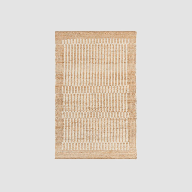 Easy to love. Easy to blend. This timeless jute accent rug plays nicely with any aesthetic, from minimal modern to eclectic boho. Mixing distinctive stripes in ecru wool with an elongated checkered pattern, each piece adds an organic warmth wherever it lands.